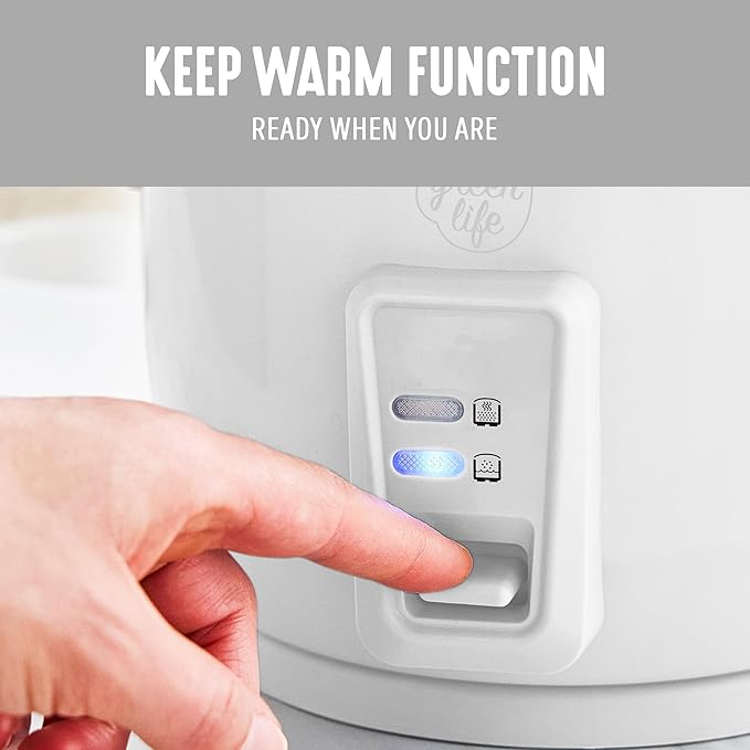 GreenLife Electric Rice Cooker, 3-Cups Uncooked/6-Cups Cooked, Removable PFAS-Free Nonstick Pot, One-Switch Design, Auto Keep Warm, Small Space Saving, Rice Paddle, Soup, Grains, Oatmeal, 1.5 QT, White