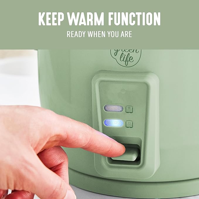 GreenLife Electric Rice Cooker, 3-Cups Uncooked/6-Cups Cooked, Removable PFAS-Free Nonstick Pot, One-Switch Design, Auto Keep Warm, Small Space Saving, Rice Paddle, Soup, Grains, Oatmeal, 1.5 QT, Green