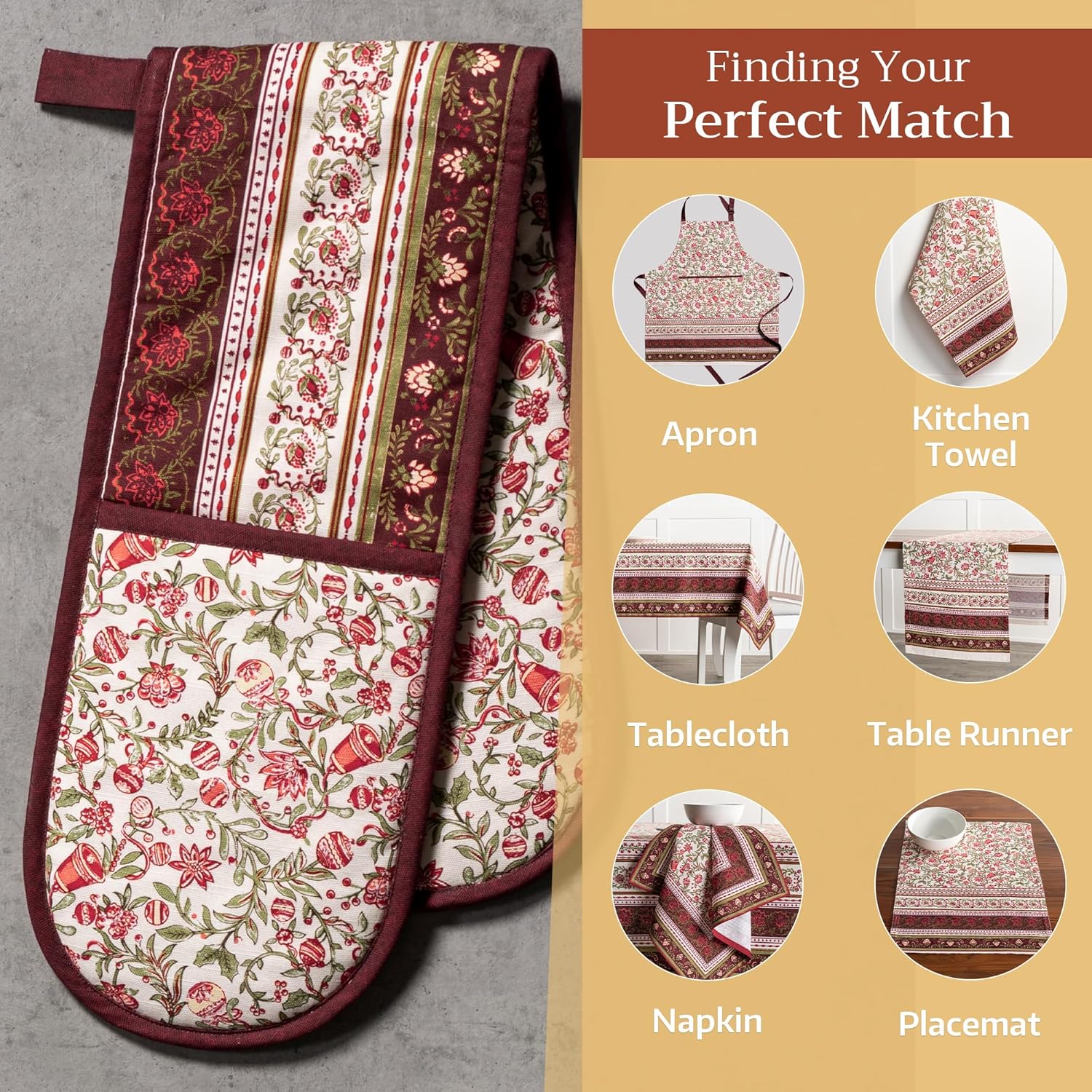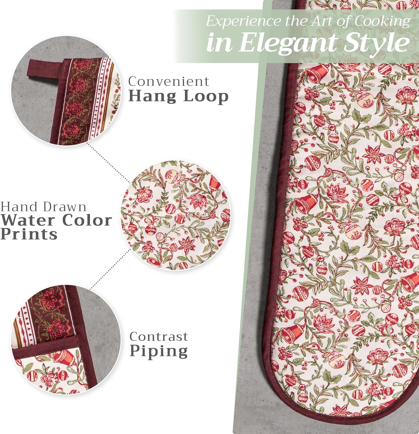 - Package includes: Includes 1 double oven mitt sized 7"x35". Perfect for handling hot cookware safely while adding a touch of European elegance to your kitchen. Designed in Europe and made in India with care