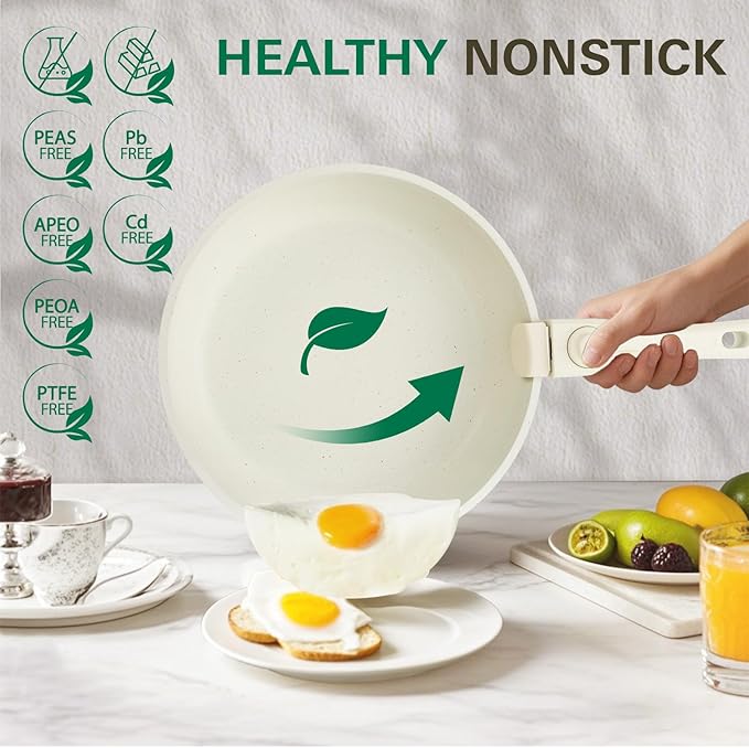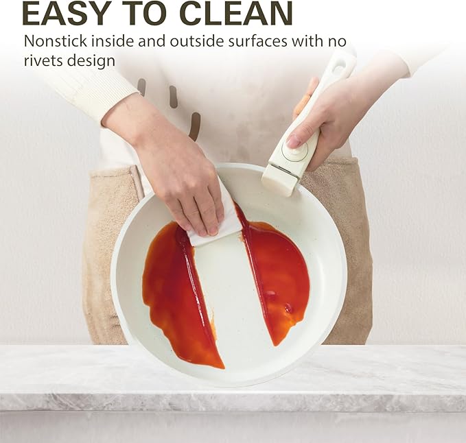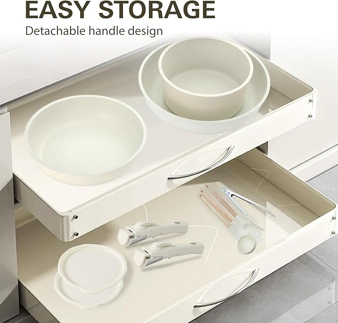 - Effortless Storage- Featuring detachable handles and stackable design, Removable with just a tap, this cookware saves 70% kitchen space when neatly stored in cabinets or drawers - perfect for compact kitchens, RVs and campers.