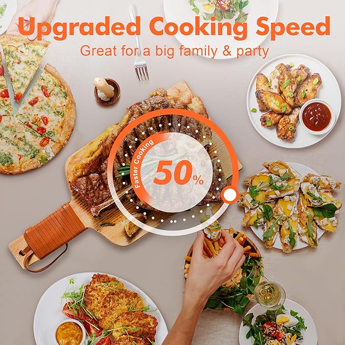 - Powerful 1800W for Faster and Time-Saving Cooking: With 6 heat elements and 1800W of power, our air fryer oven cooks quickly at temperatures up to 450°F. The double glass door reduces heat loss, enhancing cooking efficiency and speeding up the process