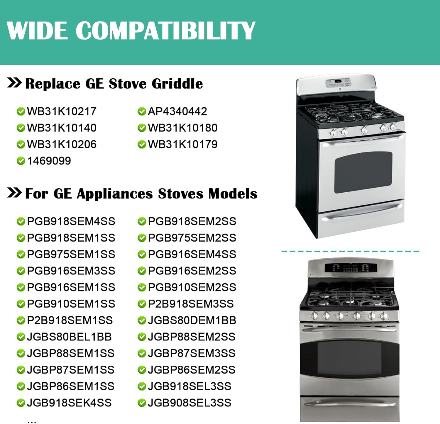 - ► Replace GE Stove Griddle Parts - WB31K10217 GE Appliances Range/Stove/Oven Griddle, AP4340442, WB31K10140, WB31K10180, WB31K10206, WB31K10179, 1469099. ► Fits GE Cooktop Appliances Stoves Models - PGB918SEM4SS, PGB918SEM2SS, PGB918SEM1SS, PGB975SEM2SS, PGB975SEM1SS, PGB916SEM2SS, PGB916SEM1SS, PGB910SEM4SS, PGB910SEM2SS, PGB910SEM1SS, PGB908SEM4SS, PGB908SEM2SS, PGB908SEM1SS, P2B918SEM3SS, P2B918SEM1SS.