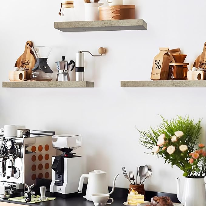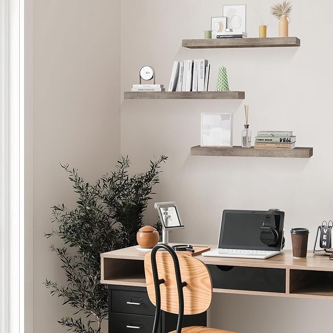 - VERSATILE AND STYLISH DESIGN: Elevate your space with our wall shelves, available in wood, black, white, and gray. These floating shelves come in two sizes (24 inches and 36 inches) and feature a natural wood texture that blends seamlessly with any decor style.