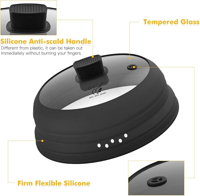 Microwave Splatter Cover Glass Cover Guard Lid with Collapsible Silicone for Food Pot Plate Cover 9.8 inch Black