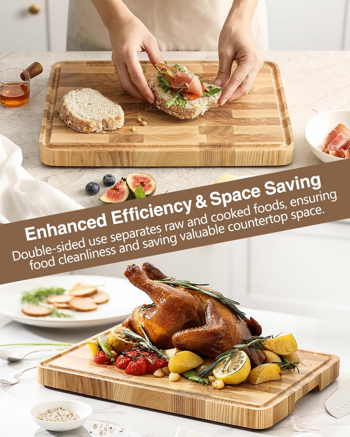 - 【Design Functionality】 Featuring a juice groove to prevent spills, recessed handles for easy transport, and non-slip rubber feet for safety, this cutting board is designed for both convenience and practicality in the kitchen; Ideal for everyday meal prep, quick weeknight dinners, entertaining guests, and holiday celebrations, this cutting board is a versatile addition to any kitchen