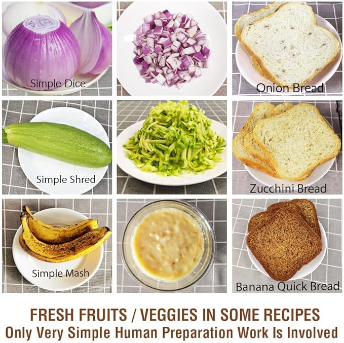 - FRESH VEGETABLES & FULLY PROGRAMMABLE - For better flavors and nutrition, we often use fresh vegetables and fruits in our recipes. - KitchenArm recipes are specially designed to handle fresh onions, oranges, potatoes, zucchini, overripe bananas, etc. in the most efficient way. - The fully programmable HOME MADE menu (Menu #19) allows you to specify each bread-making cycle time (KNEAD, REST, RISE, BAKE..) to adapt the machine to your own recipes or explore the endless bread making possibilities.