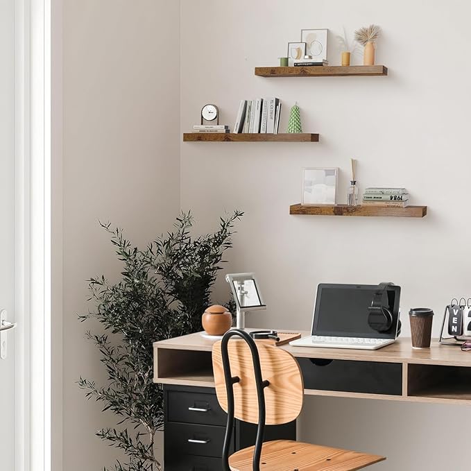 - VERSATILE AND STYLISH DESIGN: Elevate your space with our wall shelves available in wood, black, and white. These floating shelves come in three sizes (15 inches, 24 inches, and 36 inches) and feature a natural wood texture that blends seamlessly with any decor style.
