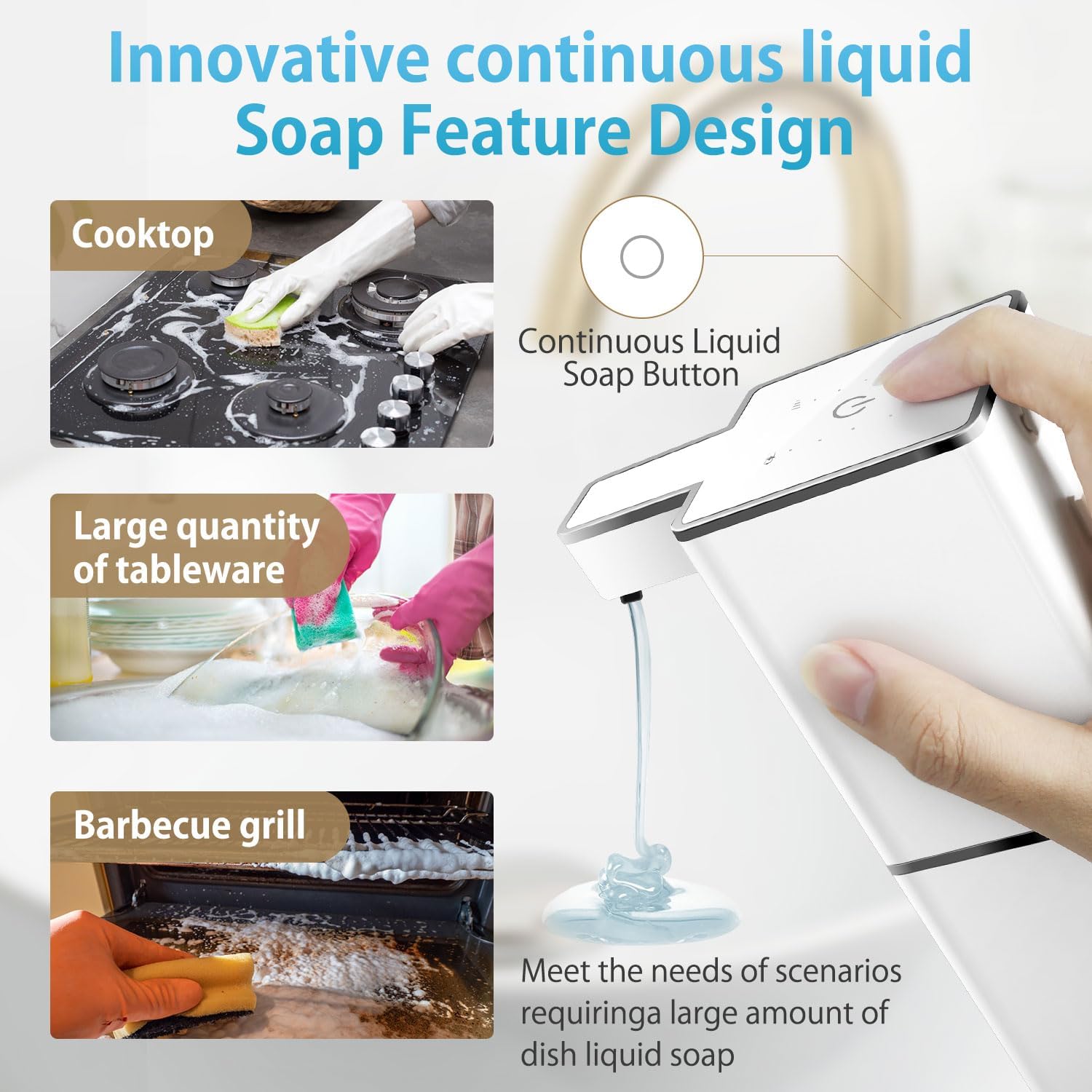 - 【Continuous Liquid Soap Design】 With a simple press of the continuous soap button, a steady stream of liquid soap is effortlessly dispensed. This feature is perfect for tasks requiring large amounts of liquid soap, such as washing multiple utensils, cleaning stovetops, dining tables, barbecue grills, and more.