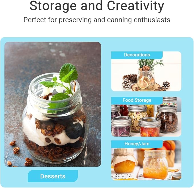 - Widely used: Multi functional cans with lids can be used for canning, storage, and decorative purposes. It is very suitable for storing various foods, such as sauces, sour and spicy sauces, flour, grains, spices, nuts, and tea. It is also perfect for wedding, party gifts and other DIY projects