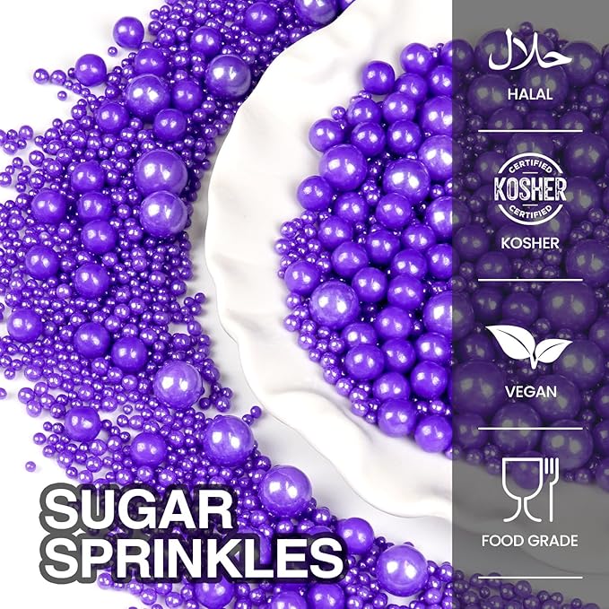 - The Edible Purple Pearl Sprinkles feature a unique mixed-size design. They are perfect for birthday cakes, cupcake toppers, cookies, ice creams, waffles, and any dessert. These sprinkles will make your baked goods prettier.