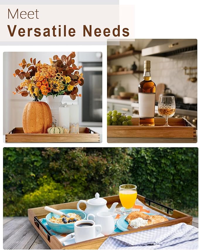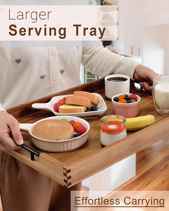 - PREMIUM ACACIA WOOD – Crafted from high-quality natural wood, this wooden tray is sturdy and durable. The unique dovetail joinery ensures long-lasting use, while the clear paint finish makes maintenance effortless.