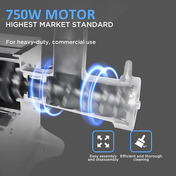 - Powerful 750W Motor for High Efficiency:The commercial meat grinder equipped with a 750W (1HP) motor, this commercial meat grinder can process up to 550 lbs of meat per hour. Designed for continuous operation, it ensures high efficiency for both home and commercial use.