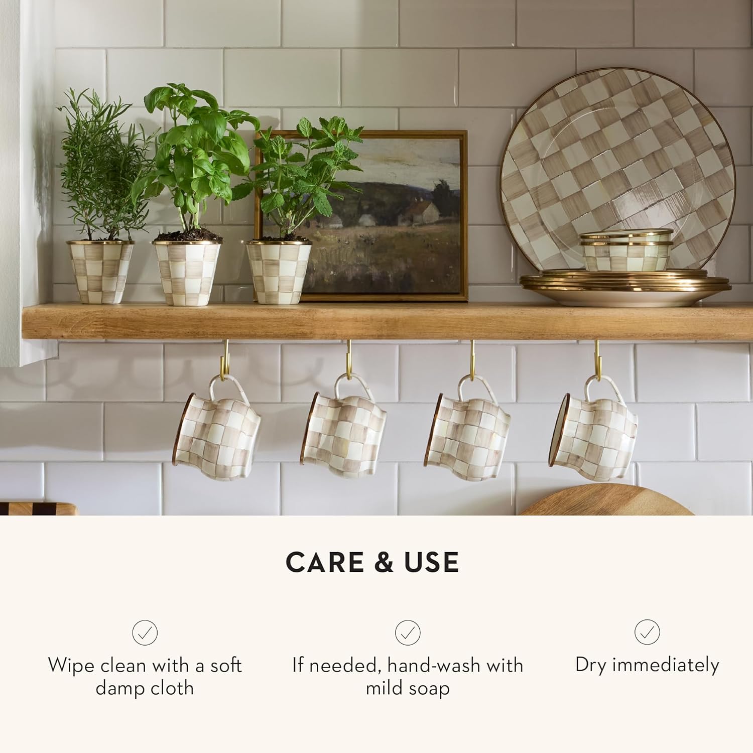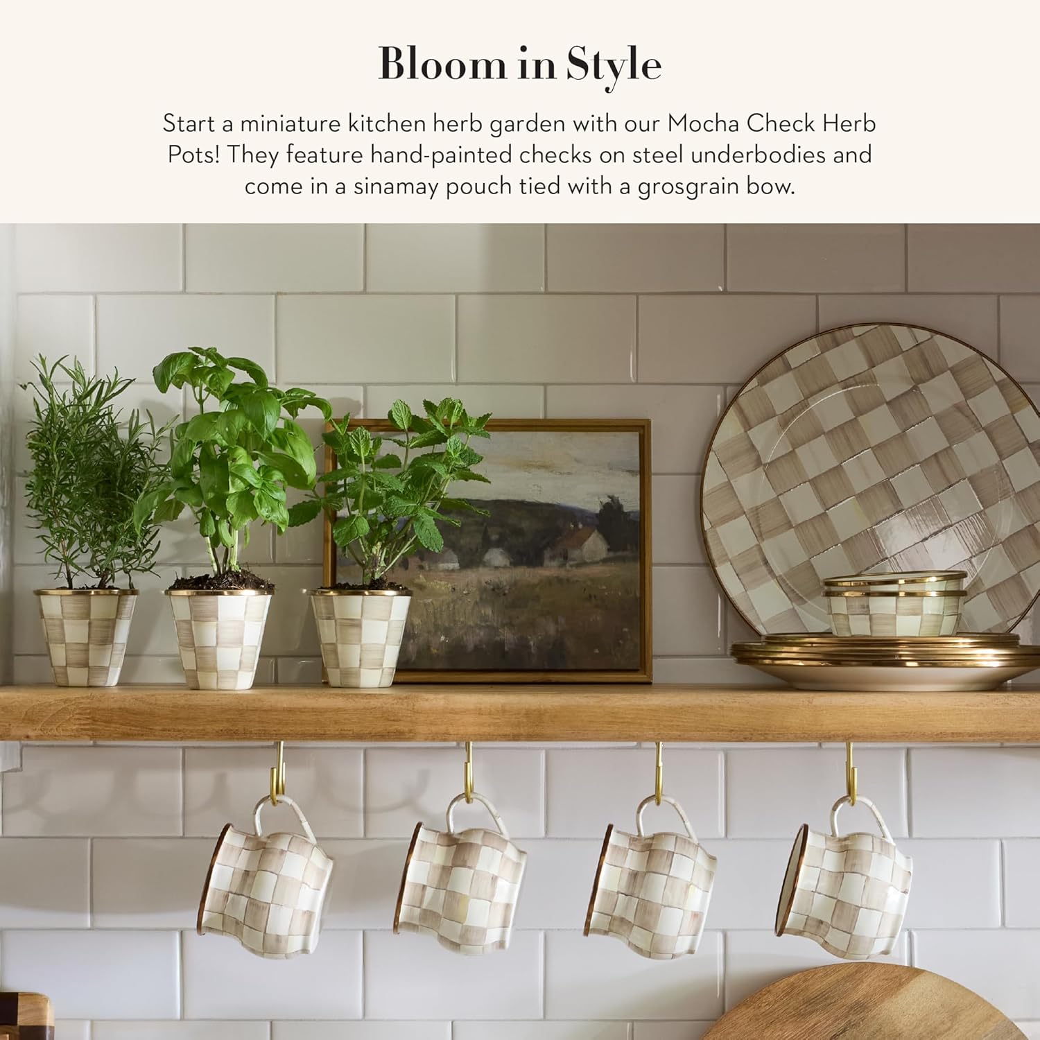 MACKENZIE-CHILDS Enamel Herb Pots, Small Plant Pots for Herbs or Flowers, Set of 3, Brown-and-White Mocha Check