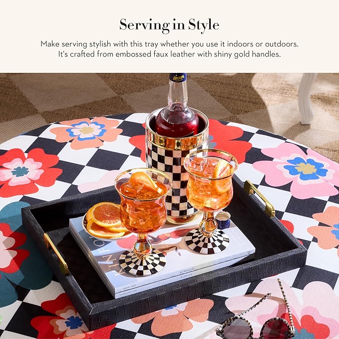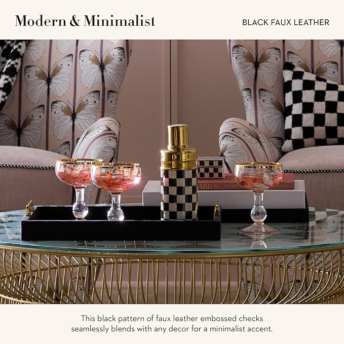 - ELEGANT ROOM ESSENTIAL: Display our chic Black Faux-Leather Tray anywhere. This black rectangle tray features an embossed faux-leather checked surface and shiny gold handles to carry it to any modern table.