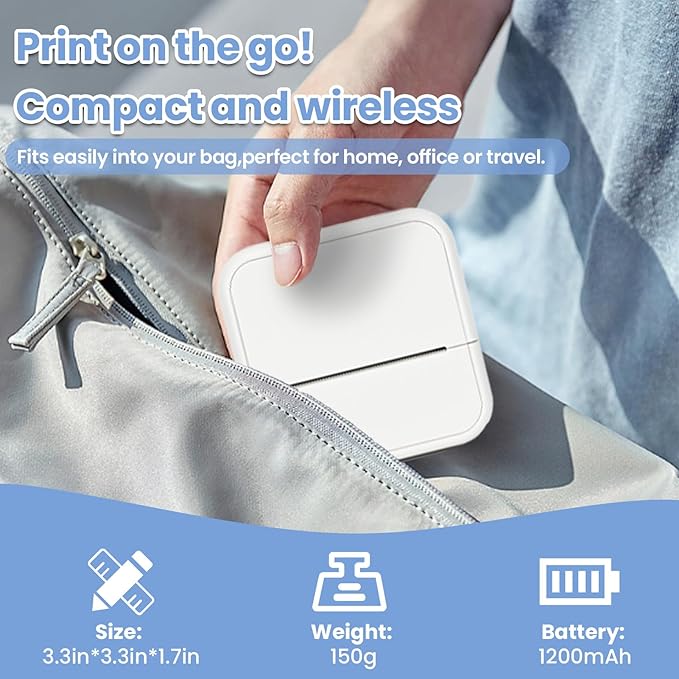 - 【Lightweight & Portable】Our mini printer is super compact and light, measuring just 3.15 x 3.15 x 1.77 inches—perfect for students, professionals, and DIY enthusiasts. It slips easily into your pocket or bag, so you can print study notes, labels, or to-do lists wherever you are.