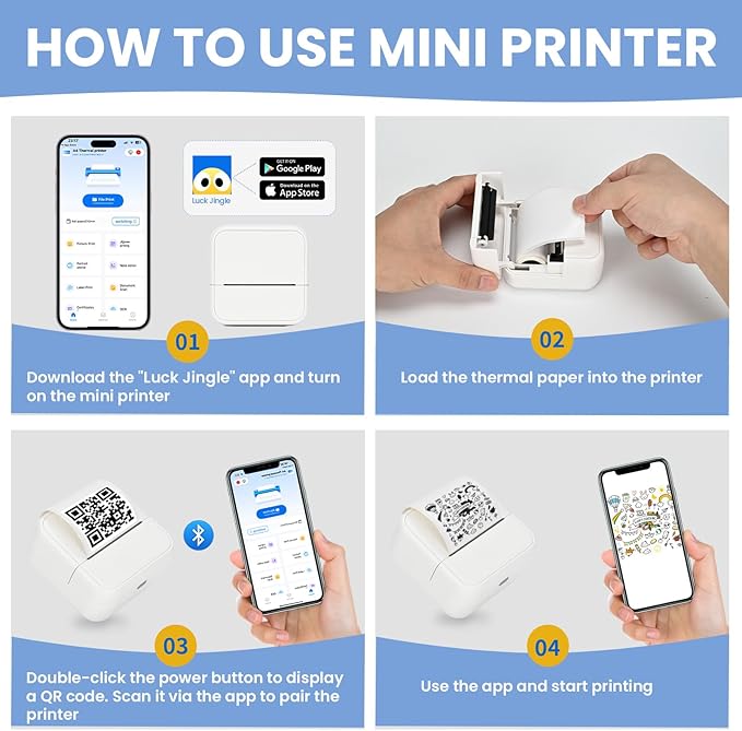 - 【Bluetooth Connectivity】Our mini sticker printer works with both iOS and Android devices and connects effortlessly, you can easily print from the Luck Jingle app via Bluetooth. 【Free Print App】The Luck Jingle app offers a huge library of free templates, can immediately print photos and text through AI Printing, OCR, Scan, Print Docs and other functions. Note: Our label printers only print in black and white, not color.