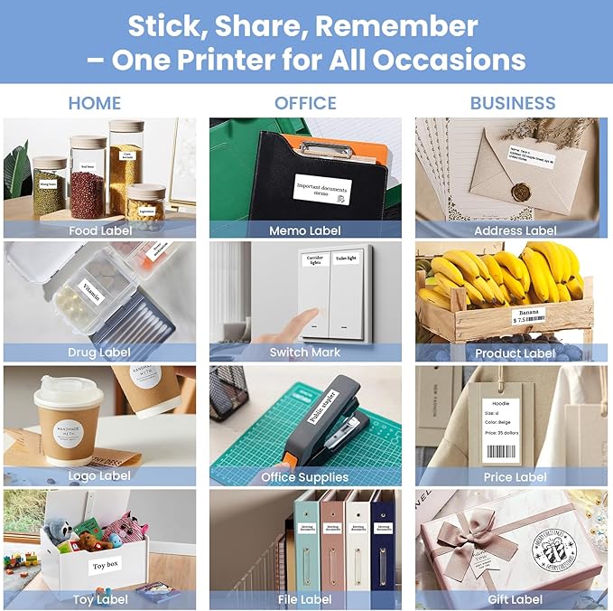 - 【Multifunctional Sticky Note Printer】This versatile mini thermal printer effortlessly produces stickers, labels, notes, to-do lists, and barcodes, catering to the diverse needs of students, small businesses, and crafters. Whether for study notes, shopping lists, work plans, greeting cards, bookmarks, or corporate task management, our Bluetooth sticker printer can efficiently complete them, significantly improving office and study efficiency.