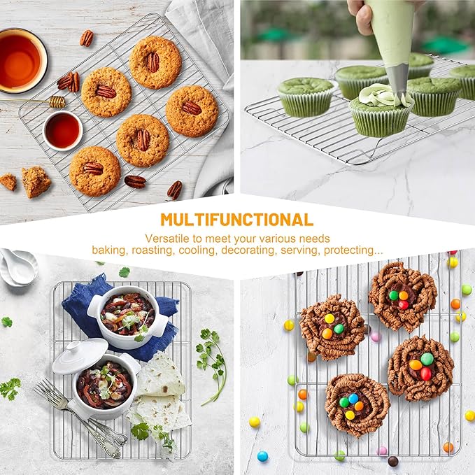- MEDIUM SIZE & VERSATILE: Measuring 11.7”x9”, Fits nicely in the oven pan, 2 pieces wire racks can help you handle various medium batch of kitchen tasks at the same time, Ideal for Cooling cookies & cakes, Baking pizzas & breads, Decorating desserts, Roasting meats & veggies, Serving snacks, Protecting pots and pans, etc., Suitable for a variety of occasions, such as at Home, Cafes, Restaurants, Bakeries...