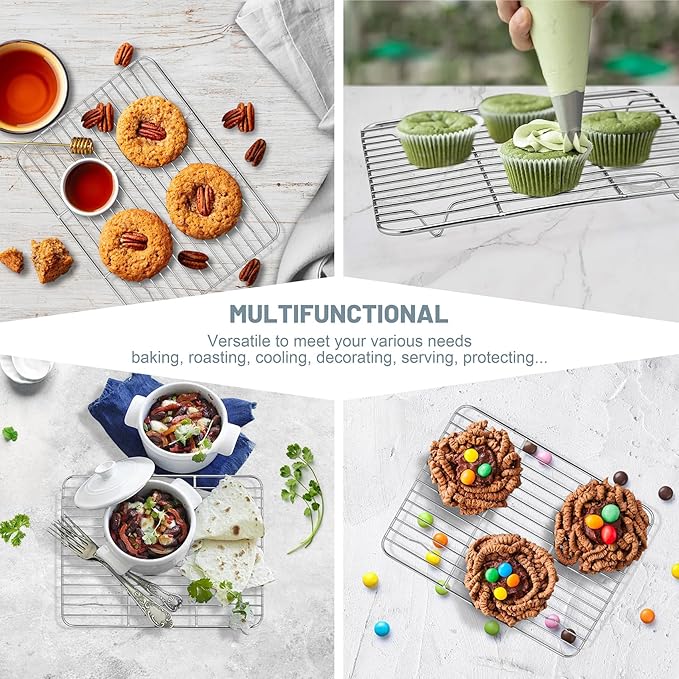 - SMALL SIZE & VERSATILE: Compact size of 9.75”x7.5” to fit most toaster oven pans, Small cooling rack is more suitable for 1-2 persons, 2 pieces helpfully handle different small kitchen tasks at the same time, Ideal for Cooling loaves and cookies, Baking breads and tarts, Roasting veggies and single steaks, Serving bacons and fries, and Putting the small hot pots without burning the counter