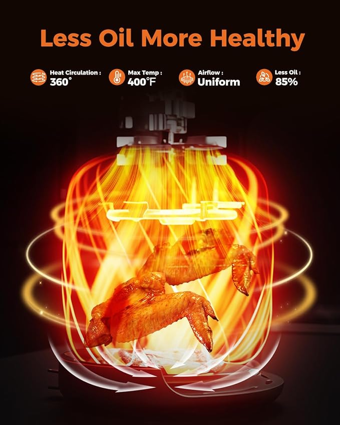 - ๐๐๐ฌ๐ฌ ๐๐ข๐ฅ ๐๐๐๐ฅ๐ญ๐ก๐ข๐๐ซ ๐๐จ๐จ๐ค๐ข๐ง๐ : With Rapid Air Circulation 360ยฐ airflow to crisp food with 85% less oil, Cooks food 30% faster than traditional ovens frying. Reduced oil use for healthier meals, enjoy crispy foods without the added calories and fats