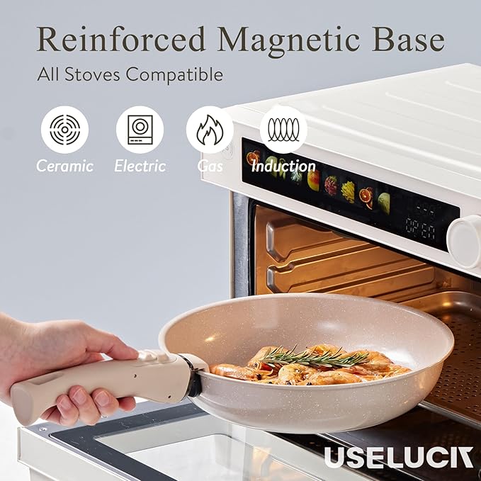 - 【Detachable Handle Cookware for Easy Storage】Our cookware with removable handles offers great convenience, allowing for compact storage. Whether you're at home or on the go, this detachable handle pots and pans set is easy to store in cabinets or RVs. The unique locking system ensures nonstick detachable pans stay securely in place