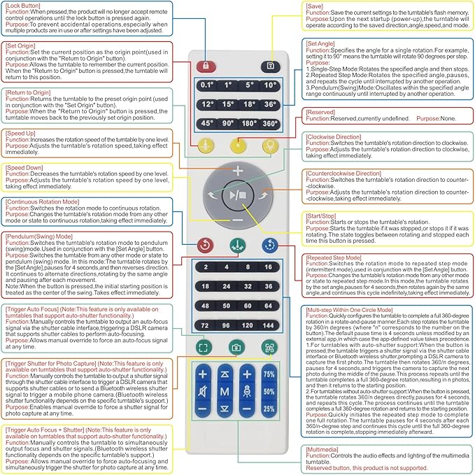 - 【This Motorized turntable includes a Professional Flagship Remote Controller】:Precise angle settings and user-friendly combination key design enable support for a wider range of applications. Support: Set the current position as the origin point (used in conjunction with the "Return to Origin" button). Support: Save the current settings to the turntable's internal flash. More versatile angle buttons and mode button combinations provide greater flexibility for various applications