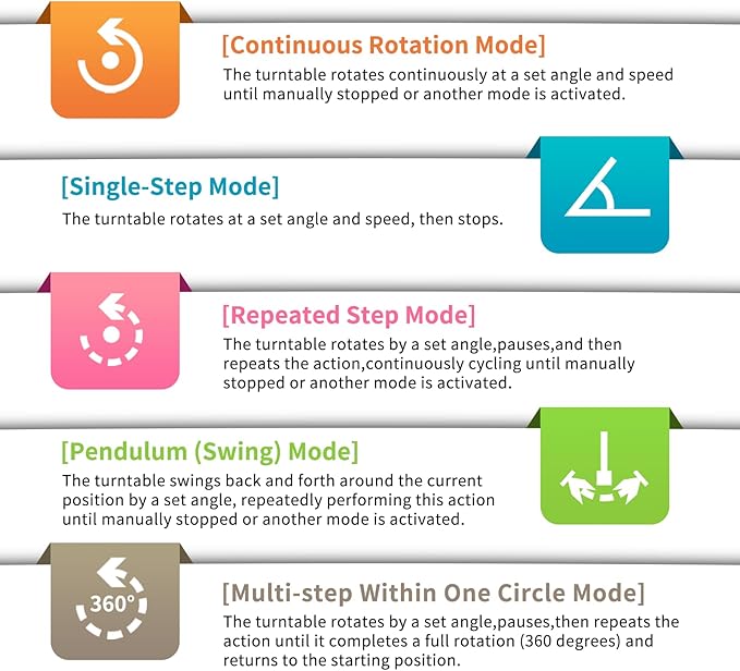 - 【The Photography Turntable Supports five rotation modes】: 【Continuous Rotation Mode】for Live Video Show.【Single-Step Mode】for Product Display and Live Demonstration.【Repeated Step Mode】 for Automated Product Display .【Multi-step Within One Circle Mode】for 360-Degree Multi-Angle Photography and 3D Scanning. 【Pendulum (Swing) Mode】 for Automatic Multi-Angle Front-and-Back Product Display. The intelligent multi-step within one circle mode makes shooting more streamlined and automated