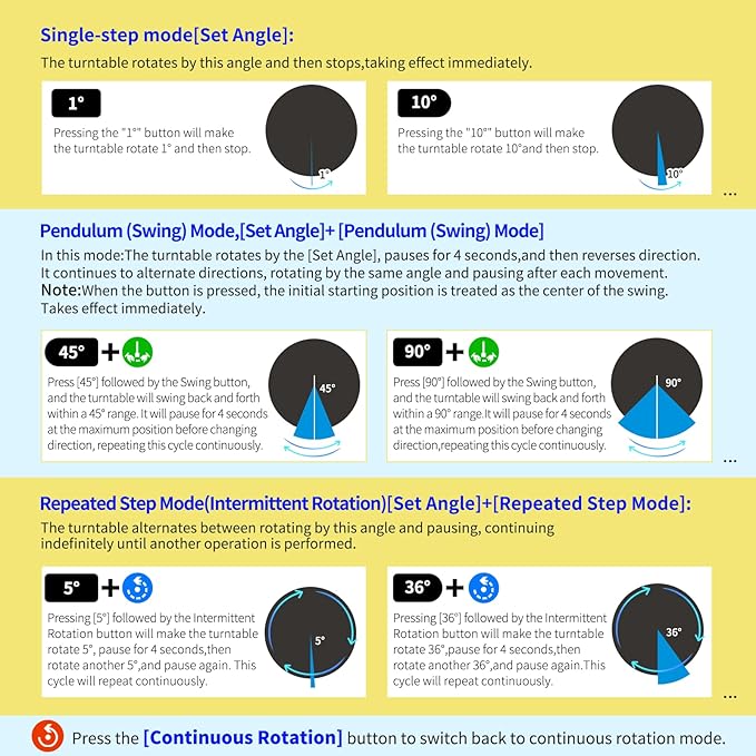 - 【This Rotating Display Stand includes a Professional Flagship Remote Controller】:Precise angle settings and user-friendly combination key design enable support for a wider range of applications. Support: Set the current position as the origin point (used in conjunction with the "Return to Origin" button). Support: Save the current settings to the turntable's internal flash. More versatile angle buttons and mode button combinations provide greater flexibility for various applications