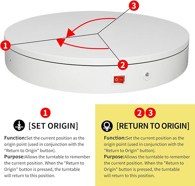 - 【This Electric turntable includes a Professional Flagship Remote Controller】:Precise angle settings and user-friendly combination key design enable support for a wider range of applications. Support: Set the current position as the origin point (used in conjunction with the "Return to Origin" button). Support: Save the current settings to the turntable's internal flash. More versatile angle buttons and mode button combinations provide greater flexibility for various applications