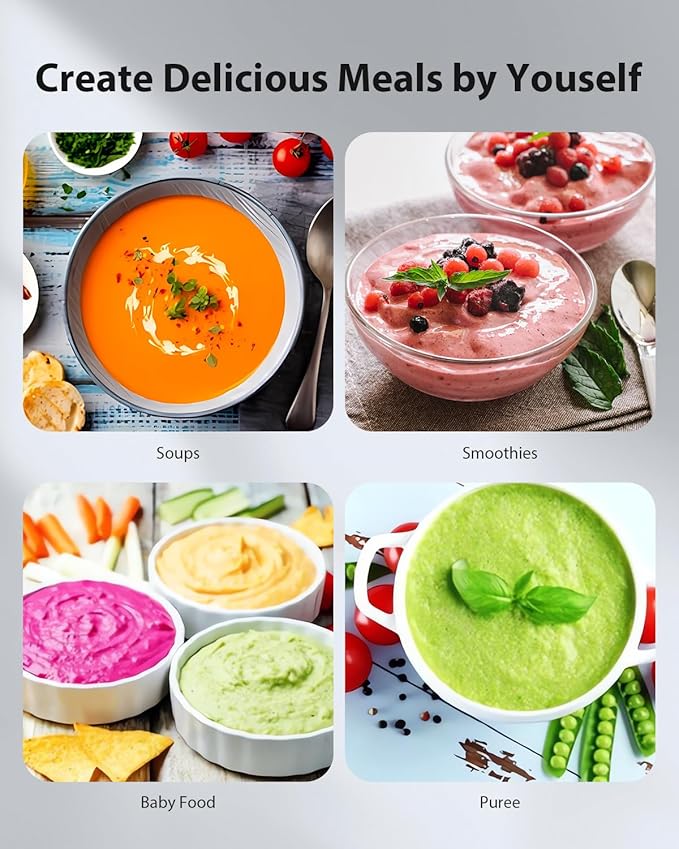 - 【4 in 1 Hand Blender】Our hand blender comes with a whisk, beaker, and chopper, making it incredibly versatile for preparing a wide range of recipes. Whether you're making smoothies, pureeing vegetables, or tackling baking tasks, this all-in-one tool helps you achieve perfect results with ease. From blending to chopping and whipping, it’s designed to simplify your cooking experience and save you time in the kitchen.