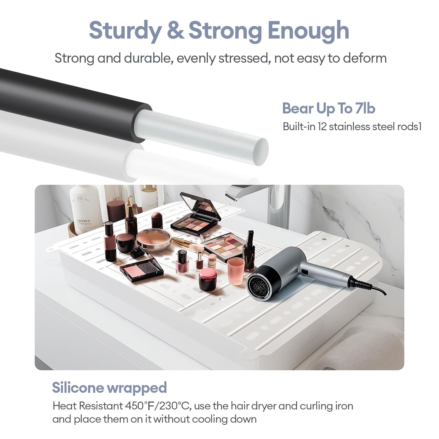 - Sturdy and durable: The sink cover for counter space is made of soft heat-resistant silicone and can withstand temperatures up to 480°F. There is no need to worry about hair dryers, curling irons, and other heating tools scalding the desktop; there is a steel rod running through the silicone, which is high temperature resistant and has a high load-bearing capacity. It is not easy to collapse and can bear up to 7 pounds.
