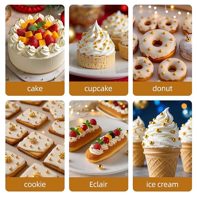 - Versatile Dessert Decoration:1 edible bottle of Gold pearl sugar, 130g/4.58 oz.Our sprinkles includes 5 different sizes of gold beads,perfect for meeting all your baking decoration needs.The sugar decorations are edibled candies.It is normal for large candies to have a hard texture and can be eaten with confidence.After baking,decorate the cookies or cake with pearl sugar to avoid melting
