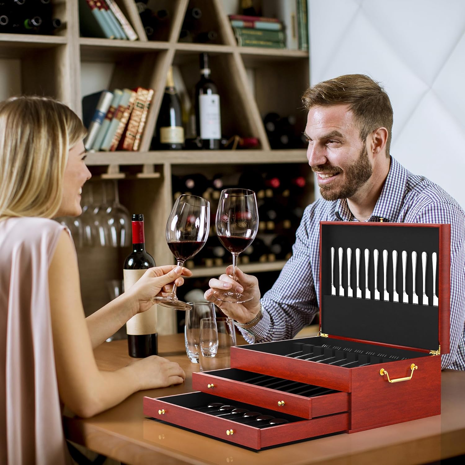 - WIDELY USED: Our cutlery storage box with handles and velvet lining is ideal for use in restaurants and kitchens. Available in a two-tone red and black finish, it allows you to store cutlery in a way that is as elegant and sophisticated as a work of art. This cutlery storage box also makes a perfect gift for housewarmings or anniversaries