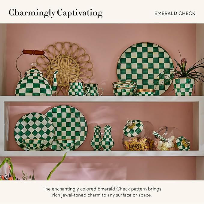 - ENTERTAINING ESSENTIAL: Serving dishes for entertaining don’t get any more charming than this. Our Emerald Check food platter features a hand-painted green-and-white checkered pattern, a heavy-gauge steel underbody, and a bronzed stainless-steel rim.