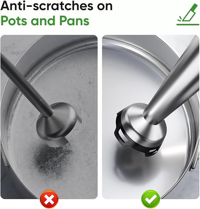 - Protect Your Cookware: This immersion blender handheld has a bell shaped base and food-grade nylon blade guard to protect your pots and pans from scratches and extend the life of kitchen tools. It also can prevents splatter to keep your clothes and kitchen clean