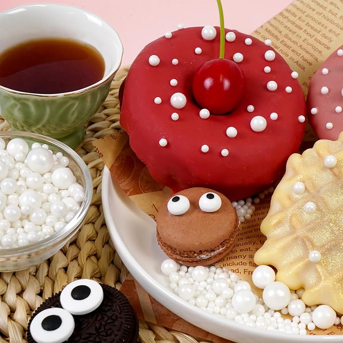 - Net Weight: 150g/5.29oz. The White Pearl Sprinkles can bring an excellent decorative effect to your desserts. White Pearl Sugar can make your baking more perfect, these pearl Sprinkles can be used to decorate Cake toppers, Cupcakes, Cookies, Chocolates, Doughnuts, Ice cream and more. Each Slightly Sweet Pearl Sprinkles has a smooth and round surface and a delicate texture.
