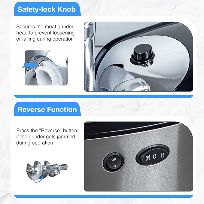 - SAFE DESIGN: The locking knob and overload protection ensure safe use. The sausage maker will turn off if overheating or overloading happens. Press the "Reverse" button to handle stuck tendons. Perfect for those who enjoy fresh homemade meats