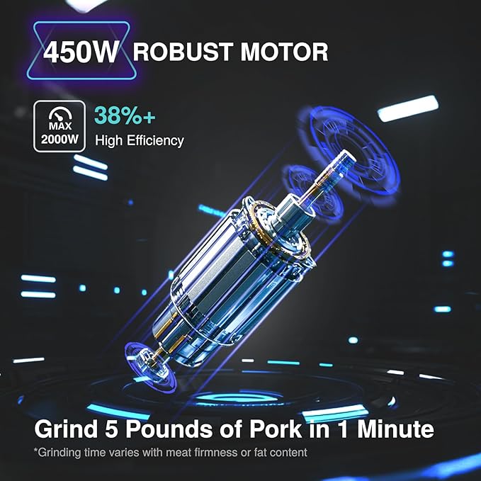 - 2 MINS GRIND 16 LBS OF CHICKEN BREAST: BBday electric meat grinder, powered by robust copper motor 2000W max, easily processes tough meats like brisket or pork shoulder. Also great for bulk-making garlic puree and onion sauce, much faster than hand-chopping