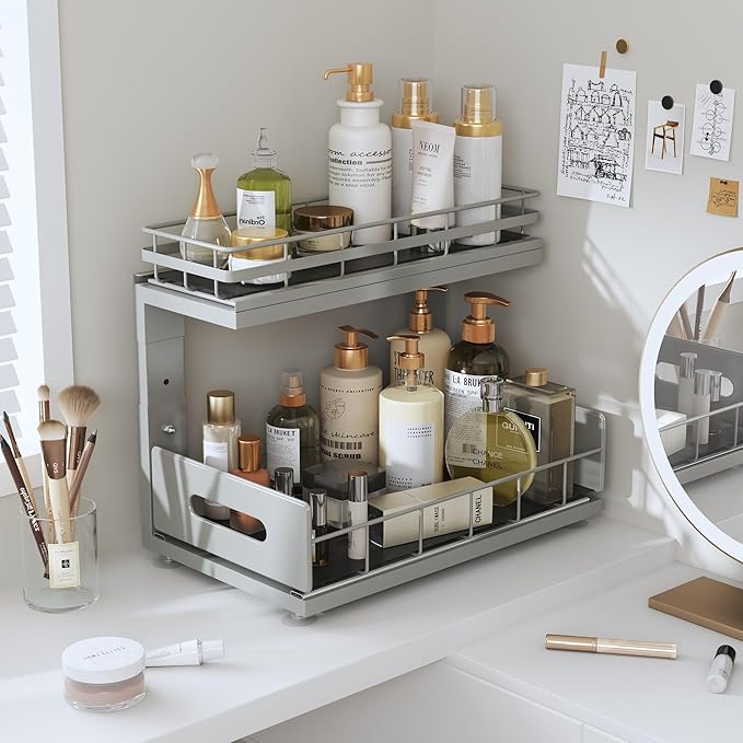 - 【Multi-Purpose Storage for Various Spaces】Ideal for under-sink storage in kitchens and bathrooms, this organizer is also perfect for bathroom countertops, vanity tables for cosmetics and skincare products, and bedroom dressers for accessories. Additionally, it’s great for storing condiments, cans, and pantry items in cabinets. Maximize your space and keep your home neat and tidy.