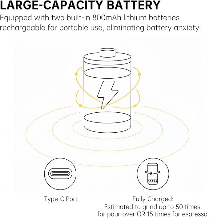 - [Extended Battery Life with Smart Energy Efficiency] - Powered by 800mAh lithium batteries, a single charge delivers up to 30-50 grinds for pour-over or 15 grinds for espresso. The smart 15-second auto shut-off not only saves energy but also ensures you enjoy fresh coffee with minimal waste.OX grinder features a replaceable battery, with a spare battery launching soon.