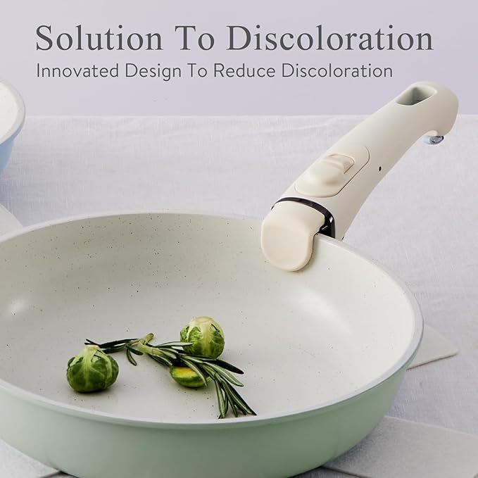 - 【Detachable Handle Cookware for Easy Storage】Our cookware with removable handles offers great convenience, allowing for compact storage. Whether you're at home or on the go, this detachable handle pots and pans set is easy to store in cabinets or RVs. The unique locking system ensures nonstick detachable pans stay securely in place