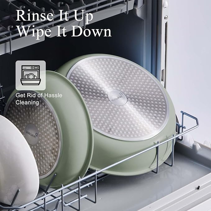 - 【Healthy Cookware Set 】: Featuring a 100% recyclable aluminum core and eco-friendly packaging (85% recycled cardboard), it helps reduce environmental impact. Our kitchen cookware set’s coating is made from natural ceramic, free from Teflon, PFAS, PTFE, PFOA, lead, or cadmium, and does not release toxic fumes, making it safe for baby food and sensitive diets. Every meal matters. Our cookware is your family's first line of defense, guarding health from breakfast eggs to dinner stews.