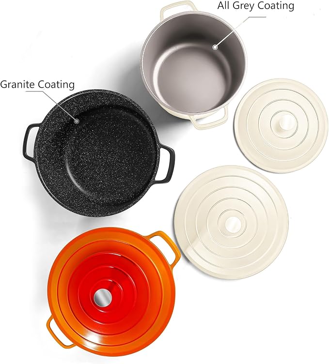 - Lightweight and Exquisite Design-Made of high-quality cast aluminum, with round shaped lid and looped handles, this Dutch oven pot is elegant looking, sturdy and light weight, a stainless-steel knob and the two handles have good grip. Non-toxic, PFOA & PTFE free material are adopted.