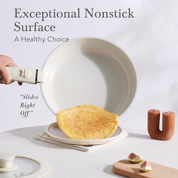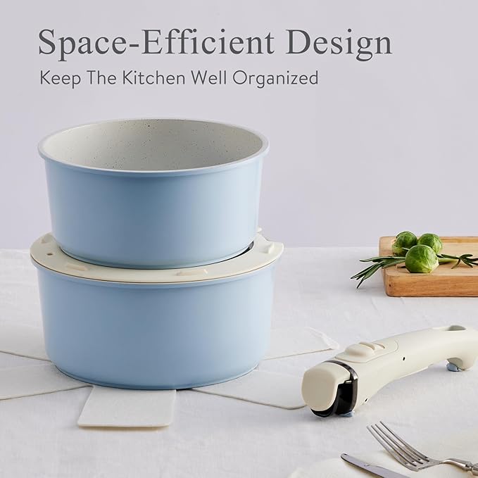 - 【Detachable Handle Cookware for Easy Storage】Our cookware with removable handles offers great convenience, allowing for compact storage. Whether you're at home or on the go, this detachable handle pots and pans set is easy to store in cabinets or RVs. The unique locking system ensures nonstick detachable pans stay securely in place