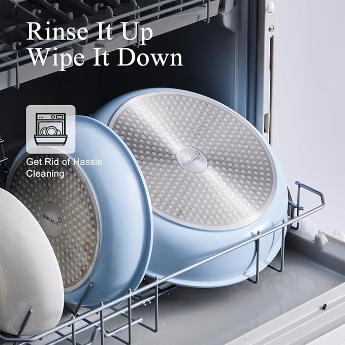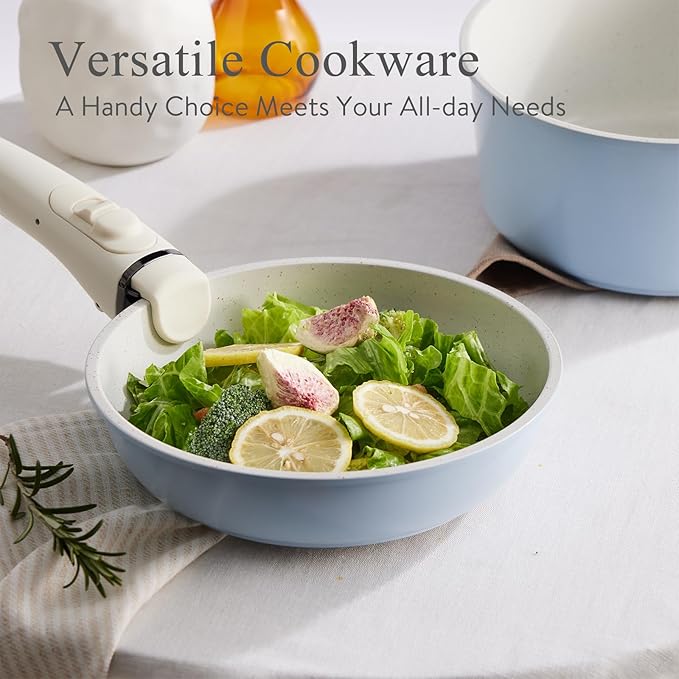 - 【Healthy Cookware Set 】: Featuring a 100% recyclable aluminum core and eco-friendly packaging (85% recycled cardboard), it helps reduce environmental impact. Our kitchen cookware set’s coating is made from natural ceramic, free from Teflon, PFAS, PTFE, PFOA, lead, or cadmium, and does not release toxic fumes, making it safe for baby food and sensitive diets. Every meal matters. Our cookware is your family's first line of defense, guarding health from breakfast eggs to dinner stews