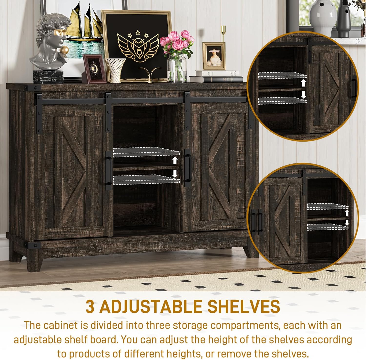 - SLIDING BARN DOOR DESIGN: This farmhouse coffee bar cabinet is designed with elegant and chic sliding barn doors, supported by durable black iron bars that can smoothly slide the doors and hide storage cabinets or central shelves, making it easy to hide even if it's messy inside. You can also place the barn door kitchen utensil cabinet in a prominent location and showcase your collection by sliding the barn door.