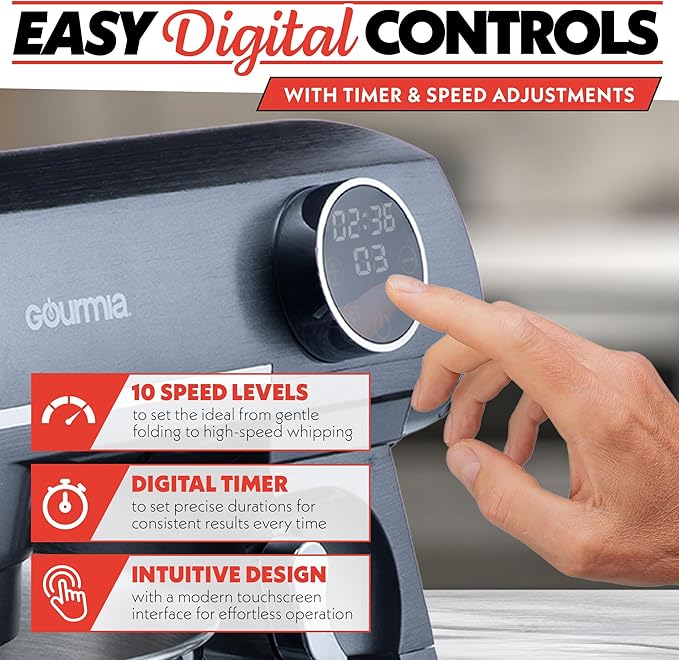 Gourmia 7 Qt Stand Mixer w/Attachments, Bowl Shield, Dough Hook, Whisk & Beater - 10-Speed Heavy Duty Kitchen Countertop Electric Dough Mixer