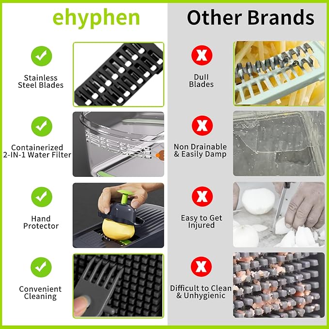 - MULTI-FUNCTIONAL VEGETABLE CHOPPER KIT - Equippedwith 7 interchangeable stainless-steel blades, enabling you to slice cucumbers, dice onions, and julienne zucchini easily. It also includes a 1.5L drainable container, an egg separator, a safety guard, a sharp peeler for root vegetables, and a handy silicone mini spatula for scraping every last bit of ingredients from bowls, making it perfect for daily cooking and holiday feasts.