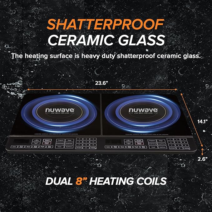 Nuwave Double Cooktop Induction Countertop Burner, Portable, 900 & 1800W, 100°F to 575°F, Large 8” Heating Coil, 50 Pre-Programmed Settings, Shatter-Proof Ceramic Glass, Built-In Safety Auto Shut Off