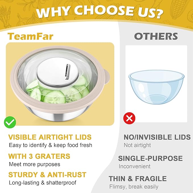 - FOOD-SAFE & LONGEVITY: Our mixing bowls with lids and graters set is made of food grade stainless steel and non-toxic plastic lids, No harmful chemicals to ensure users’ health and safety, Rust and chip resistant, Heavy duty construction make them not easy to break and deform, Stand the test of time and great for long-term use, A huge plus – the bowls are oven safe except for the lids